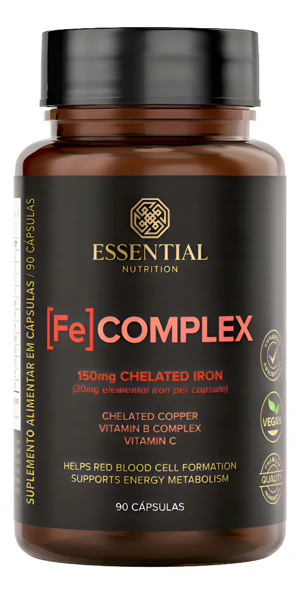 Suplemento de ferro em cápsulas desenvolvido com ferro quelado, vitamina C, cobre quelado e vitaminas do complexo B para uma ação mais completa e eficiente.